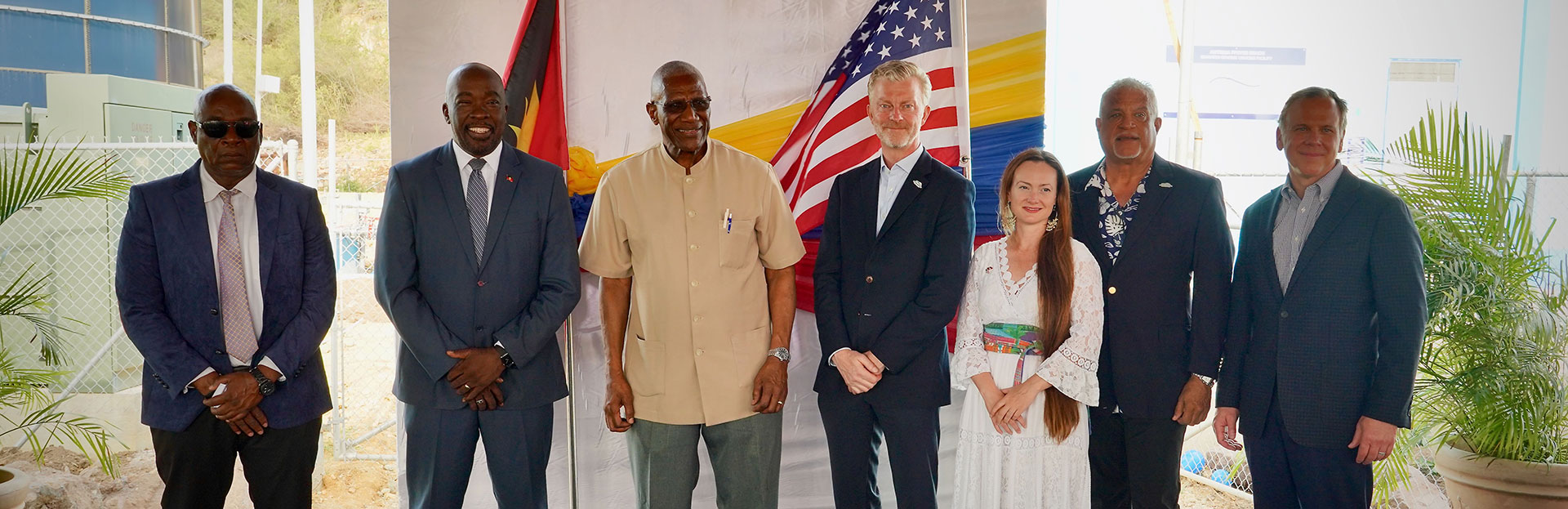 Left to right: John Bradshaw, General Manager APUA, Hon. Melford Nicholas, Minister of Public Utilities, H.E. Sir Rodney Williams, Governor General of Antigua and Barbuda, Erik Arfalk, SVP Business Development SSWG, Tabitha Snowbarger, Antigua and Barbuda Country Officer, U.S. Embassy, John Maginley, SSWG Local Business Advisor, Dan Kennedy, Chief Operating Officer SSWG